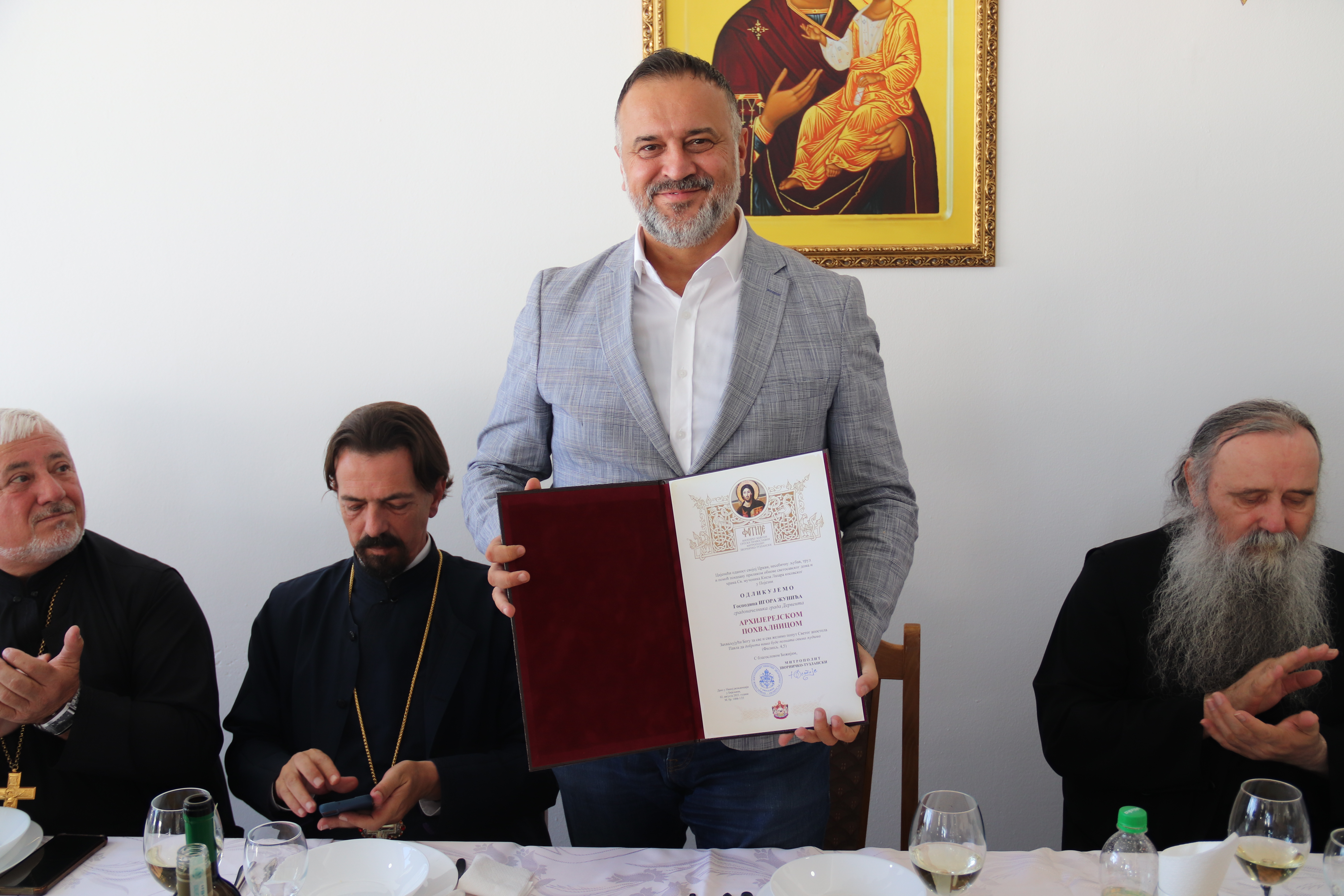 Njegovo visokopreosveštenstvo arhiepiskop i mitropolit zvorničko-tuzlanski g. Fotije odlikovao je danas gradonačelnika Igora Žunića arhijerejskom pohvalnicom za nesebičnu ljubav, trud i pomoć pokazanu prilikom obnove svetosavskog doma i hrama Svetog velikomučenika Kneza Lazara kosovskog u Pojezni.
