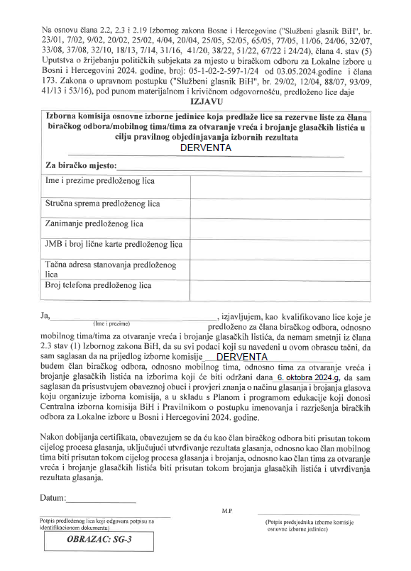 Objavljuje se Javni oglas za izbor kandidata za popunu rezervne liste kvalifikovanih osoba za imenovanje članova biračkih odbora / mobilnog tima i njihovih zamjenika.