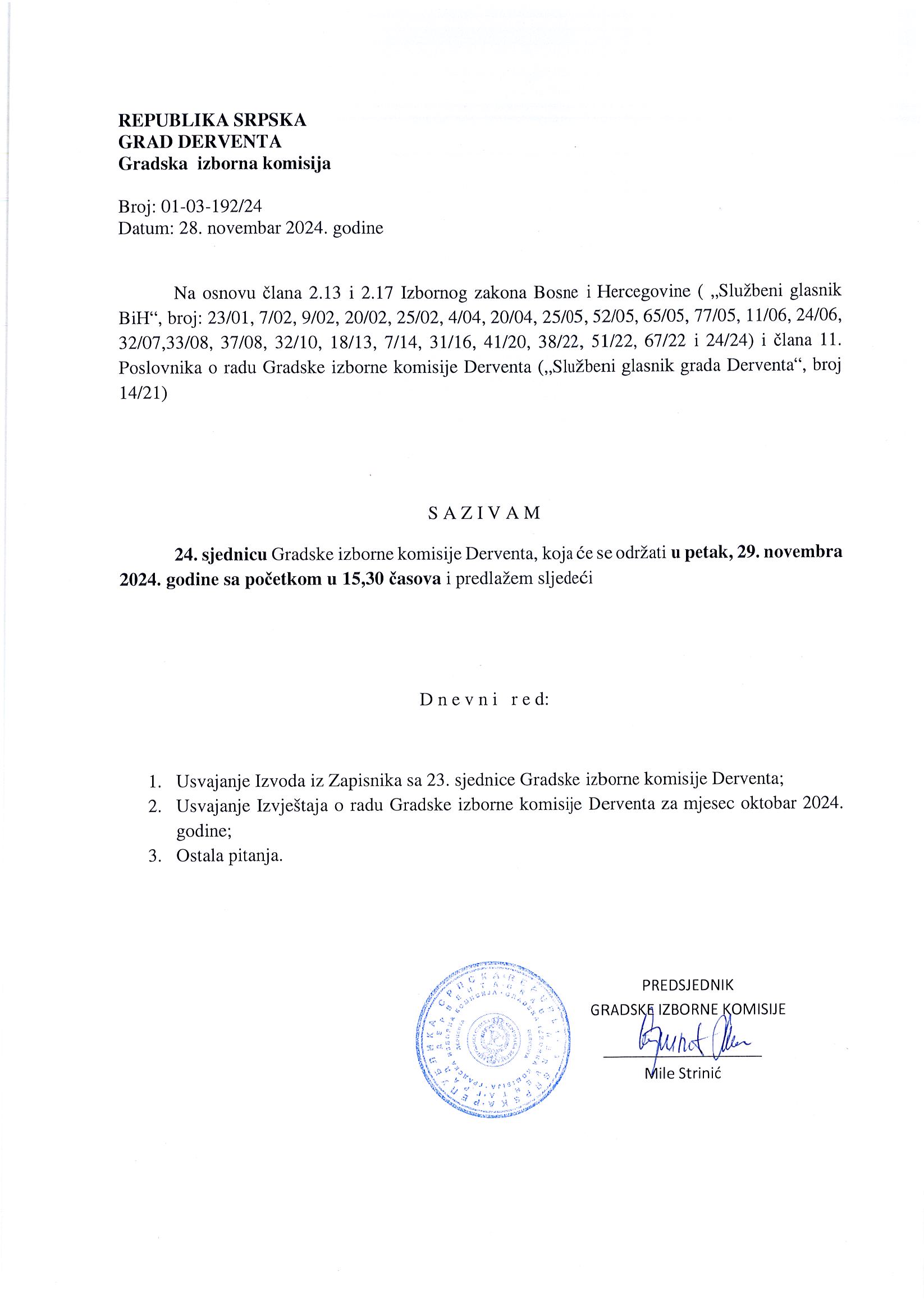 Poziv za 24. sjednicu Gradske izborne komisije Derventa