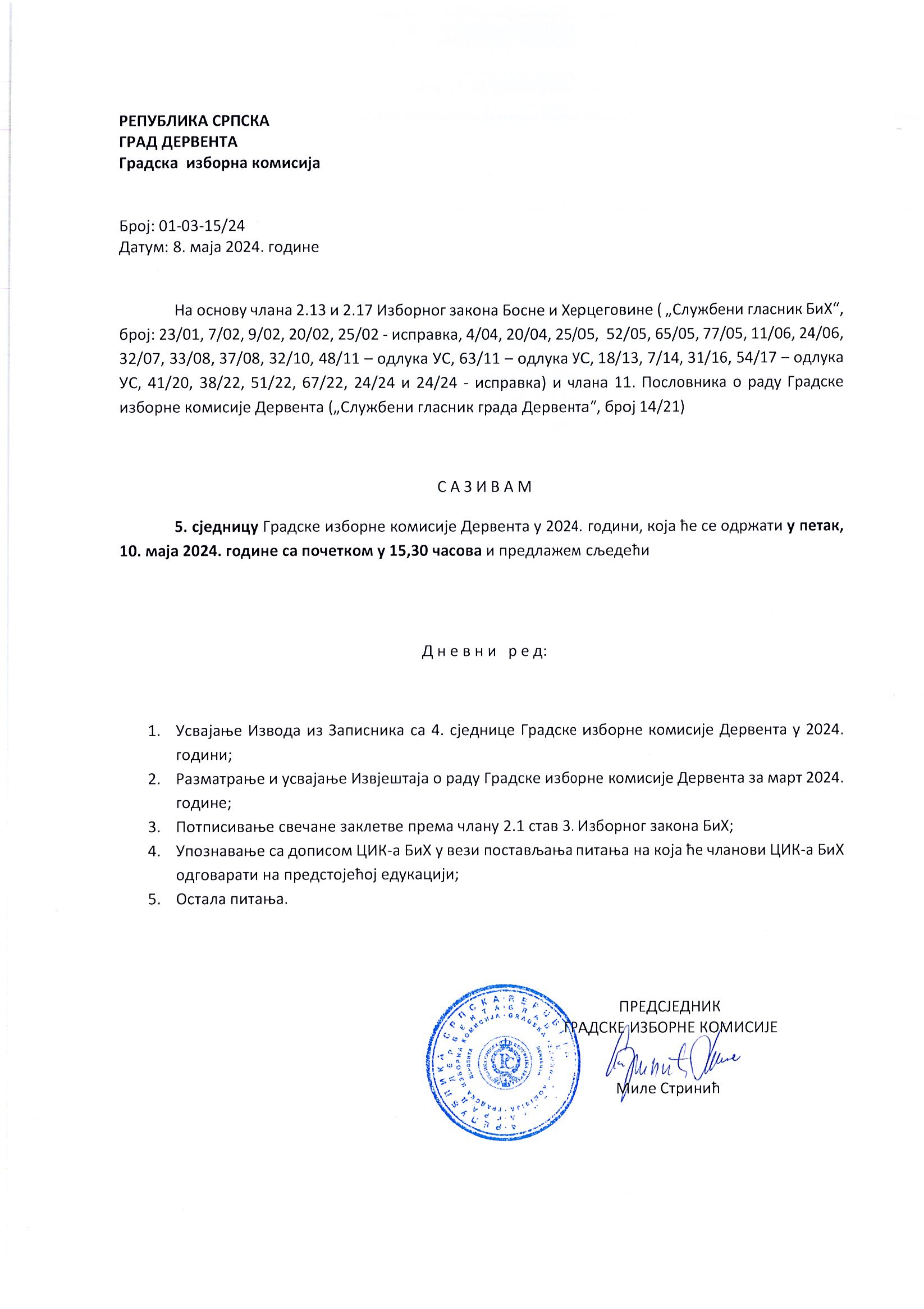 Сазив 5. сједнице ГИК Дервента у 2024. години